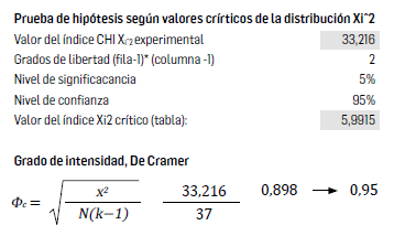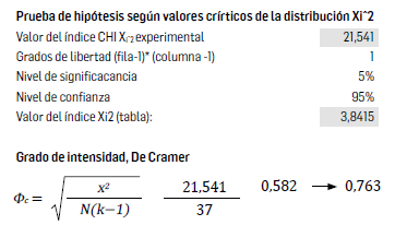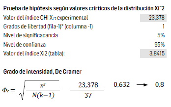 Para completar este análisis se indagó acerca del nivel de satisfacción percibido en materia de remuneración económica (tabla 1, columna 4) que evidencia entre los encuestados un nivel de insatisfacción alto (76%). De forma adicional se consideró relevante establecer la posible correlación entre las variables “3. Prevalencia del interés individual” y “4. Satisfacción en la remuneración”, para ello se aplicó la prueba estadística chi cuadrada (Xi2) para analizar la posible relación entre las variables mencionadas, así: