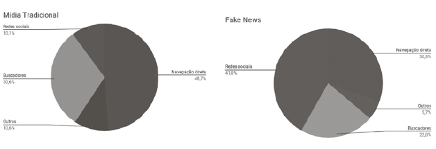 Os gráficos acima apresentam os dados coletados pela Amazon Alexa (alexa.com) de tráfego, acesso e compartilhamento de notícias, da mídia tradicional e de fake news, respectivamente, entre o fim de outubro e o fim de novembro, no período eleitoral de 2016 nos Estados Unidos. As informações consolidadas corroboram com a afirmação de que as redes sociais são um espaço extremamente propício para a disseminação de fake news. Como se observa, apenas 10,1% dos acessos a notícias, tidas como verdadeiras pelo monopólio da verdade da mídia tradicional, se deram por meio das redes sociais, enquanto de fake news o número quadruplica, atingindo quase 42 pontos percentuais.