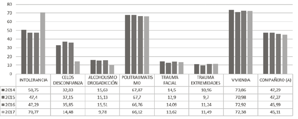 No sin razón, la intolerancia y el machismo son los factores más comunes, en tanto se asocian al lugar donde ocurren estos hechos, con un porcentaje más o menos estable del 73,86 % en el 2014 y un 72,38 % en el 2017. Es al interior de la misma vivienda de la víctima donde ocurren estos hechos, siendo el politraumatismo, el trauma facial y el trauma de las extremidades los daños más significativos en las agresiones contra las mujeres, con porcentajes muy similares en dichos años. Todo ello sumado a que el principal causante de la agresión, como lo podemos observar en la figura anterior, es el compañero, con un porcentaje del 47,29 % en el 2014 y un 45,11 % en el 2017.