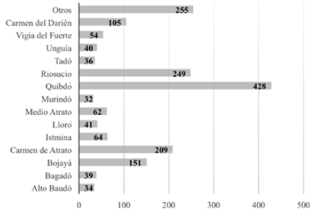 Pero, sobre todo, donde se ha intensificado con mayor fuerza la violencia es en la subregión del Bajo Atrato y del Darién. En esta zona del departamento se ha presentado bastante influencia, a partir de la cercanía con el Urabá antioqueño, la zona del Golfo del Atrato y todo el control territorial que se hace a través del río Atrato. Todo esto se hace más favorable para los grupos armados por las condiciones topográficas del departamento, ya que más del 70 % de ingreso a la región, según datos del dane, se realiza a través de los diferentes ríos, los cuales permiten la articulación de las comunidades y el encuentro con otros espacios. En lo relacionado al control de dichos ríos se nota el interés de los diferentes actores armados para saber cuáles son las personas que se movilizan a través de estos, así como la salida e ingreso de armas y la producción y comercialización de los cultivos ilícitos.