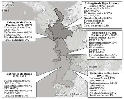 | Actor victimizante | Subregión del Alto y Medio Atrato | Subregión de la Costa Pacífica | Subregión del Bajo Atrato y Darién | Subregión del Baudó | Subregión de San Juan | Total | Porcentaje |