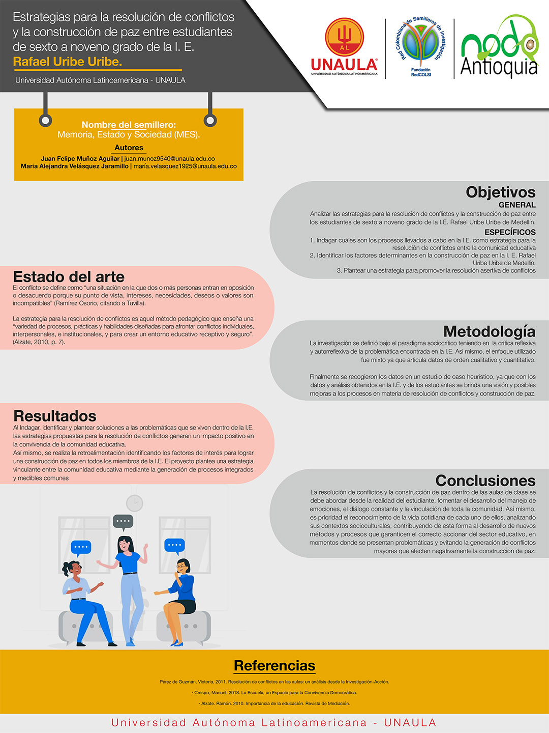 Muñoz Aguilar, J. F., & Velásquez Jaramillo, M. A. (2022). Estrategias para la resolución de conflictos y la construcción de paz entre los estudiantes de sexto a noveno grado de la I. E. Rafael Uribe Uribe. Conocimiento Semilla, (7). Recuperado a partir de https://publicaciones.unaula.edu.co/index.php/semilla/article/view/1460